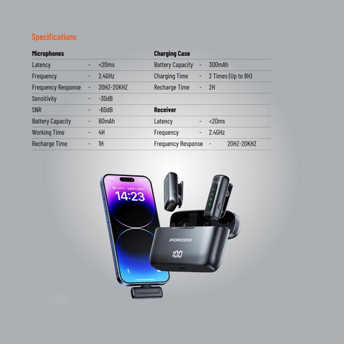 این شرکت در حال معرفی میکروفون دوگانه Porodo Lavalier با جعبه شارژ است، یک راه حل صوتی با تکنولوژی بالا که برای سازندگان محتوا و حرفه ای ها به طور یکسان هدف قرار گرفته است. این کیس شارژ دارای ظرفیت باتری 300 میلی آمپر ساعتی است که می تواند میکروفون های شما را نه یک بار بلکه دو بار به طور کامل شارژ کند. در عرض 2 ساعت، دوباره تمام می شود و برای ضبط صدای شفاف و با کیفیت آماده می شود. هر میکروفون دارای حساسیت چشمگیر -30dB برای بازتولید صدای شفاف با جزئیات قابل توجه است. تأخیر کم و ضبط صدای بی عیب و نقص برای مصاحبه ها، ارائه ها و وبلاگ نویسی عالی هستند. یک صفحه نمایش دیجیتال قدرت باقیمانده باتری و وضعیت فعلی اتصال را نشان می دهد، زیرا عملکرد plug-and-play فرآیند راه اندازی سریع را انجام می دهد. سیستم میکروفون دوبل Porodo Lavalier برای استفاده طولانی ساخته شده است: با 12 ساعت کار ترکیبی، می توانید بدون مزاحمت زمان خود را صرف فعالیت های خلاقانه خود کنید. سیستم میکروفون قابل اعتماد و کارآمد آن تجربه صوتی شما را به سطح جدیدی می برد.